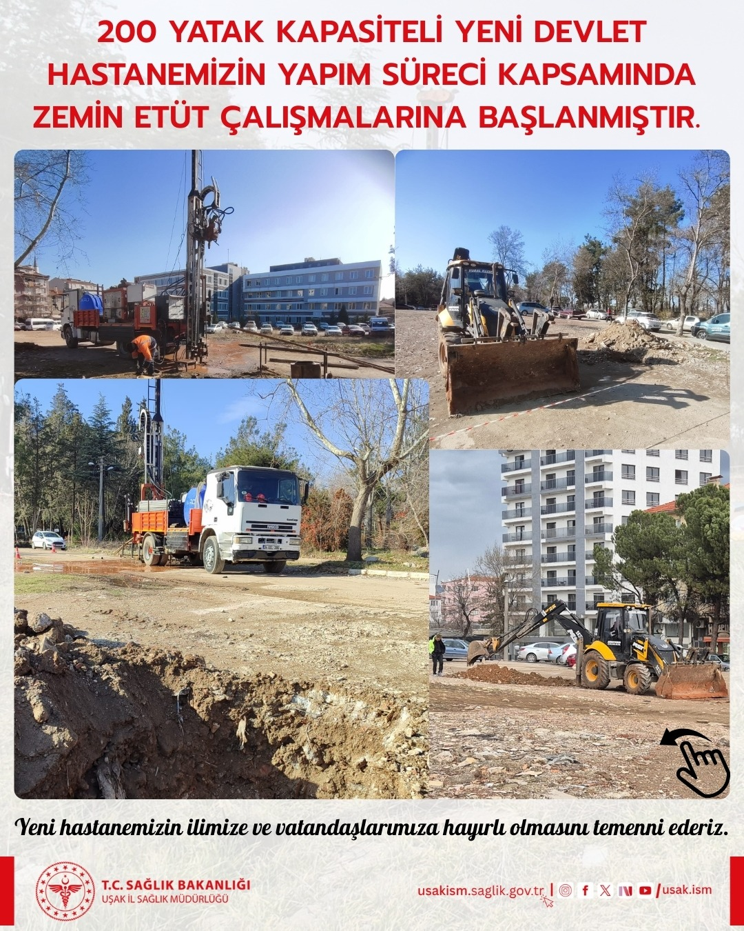 Uşak’ta yapımı planlanan 200 yatak kapasiteli yeni Devlet Hastanesi projesi kapsamında zemin etüt çalışmalarına resmen başlandı. Çalışmalar, Uşak İl Sağlık Müdürlüğü koordinesinde, belirlenen teknik kriterler ve planlanan takvim doğrultusunda yürütülüyor.