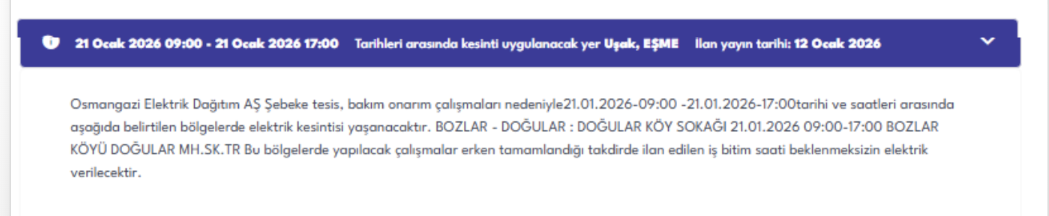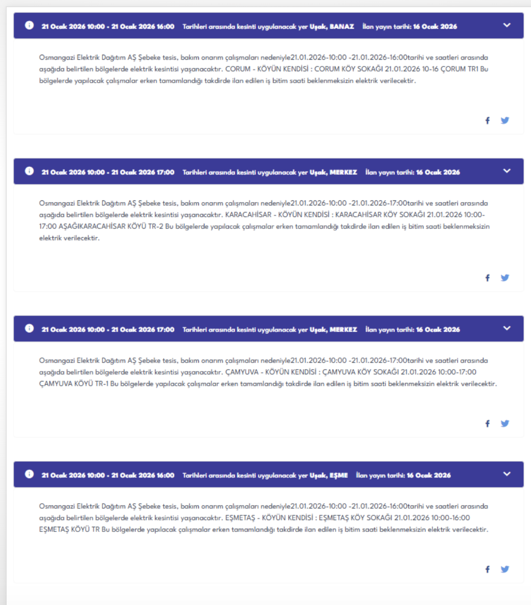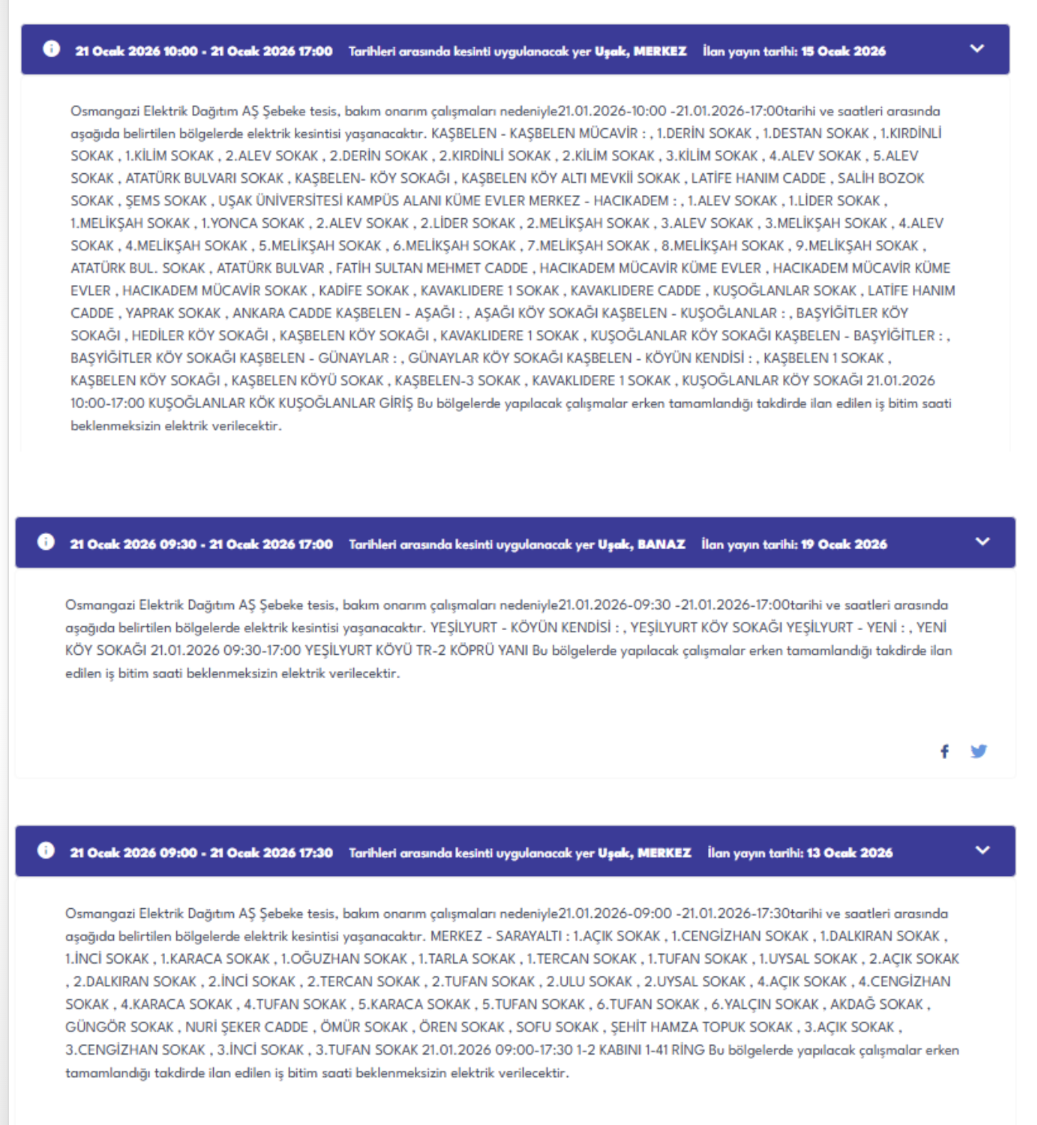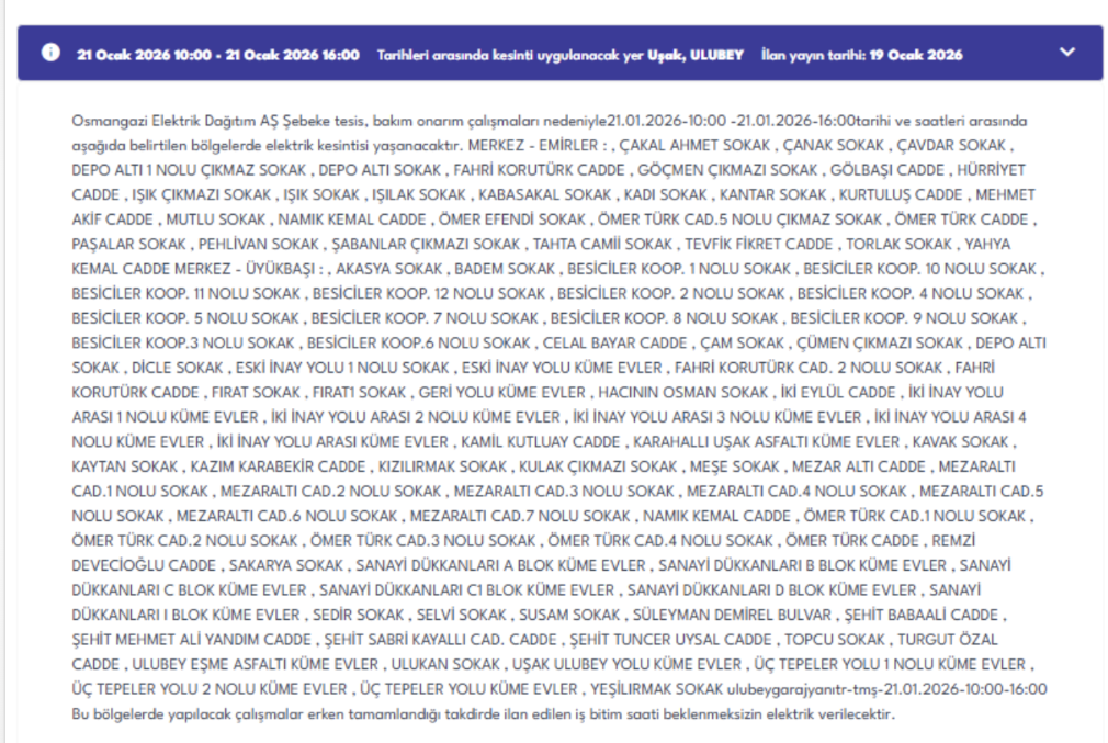Osmangazi Elektrik Dağıtım AŞ tarafından yayımlanan resmi duyuruya göre, 21 Ocak 2026 Çarşamba günü Uşak genelinde şebeke tesis, bakım ve onarım çalışmaları nedeniyle çok sayıda ilçe, mahalle ve sokakta planlı elektrik kesintisi uygulanacak.