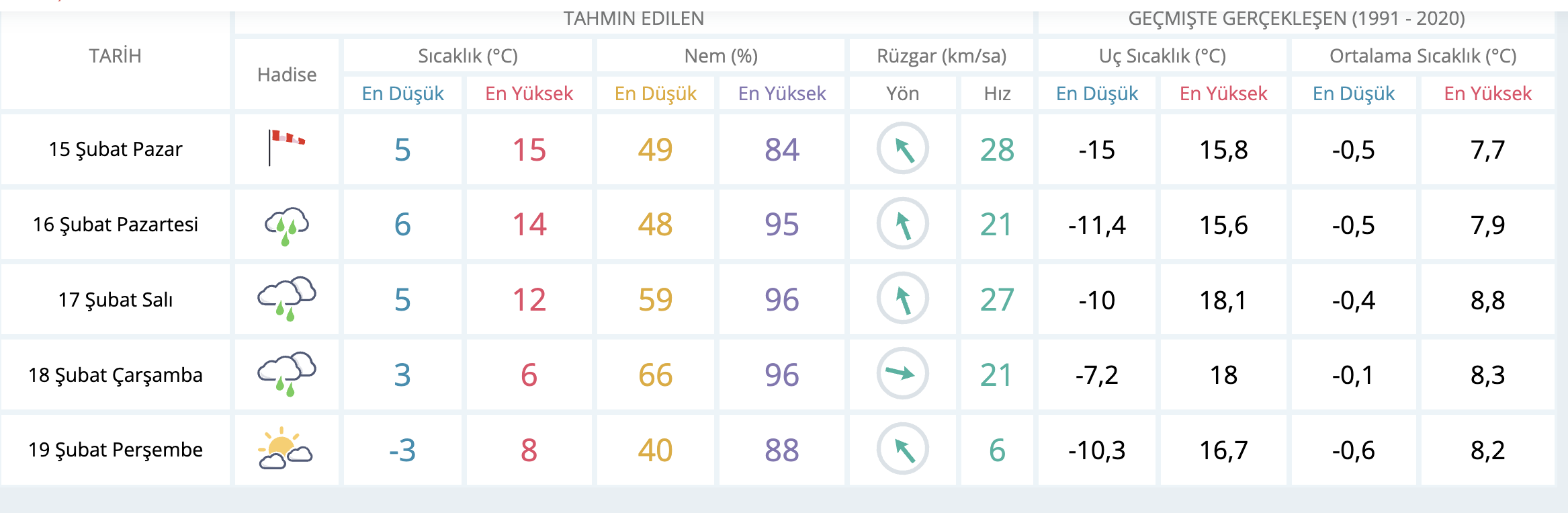 En düşük sıcaklık değerlerine bakıldığında ise 15 Şubat’ta 5°C, 16 Şubat’ta 6°C ve 17 Şubat’ta 5°C ölçümleri tahmin edilirken, 18 Şubat’ta 3°C seviyesine gerilediği, 19 Şubat Perşembe günü ise -3°C ile haftanın en düşük değerinin tabloda yer aldığı görüldü.