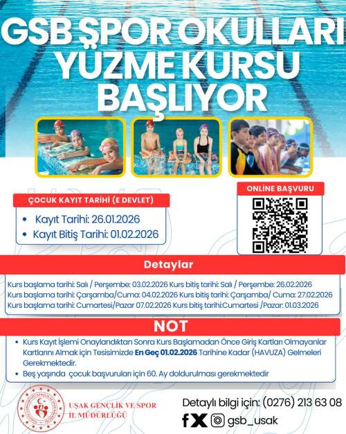Uşak Gençlik ve Spor İl Müdürlüğü tarafından düzenlenen GSB Spor Okulları Yüzme Kursu için kayıt süreci başlıyor. Çocukların sporla tanışmasını ve yüzme becerilerini geliştirmeyi amaçlayan kurslara başvurular e-Devlet üzerinden alınacak.