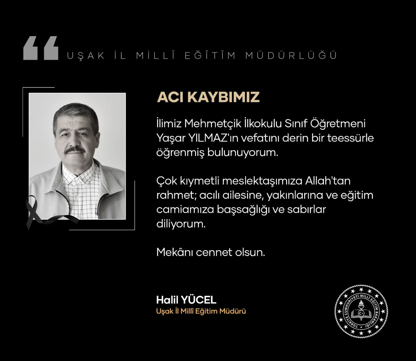 Taziye mesajı Uşak İl Milli Eğitim Müdürü Halil Yücel tarafından paylaşıldı.