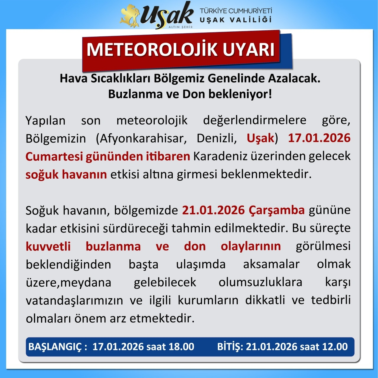 Meteorolojik uyarıya göre, soğuk havanın 21 Ocak 2026 Çarşamba gününe kadar bölgede etkisini sürdürmesi öngörülüyor. Bu süreçte özellikle kuvvetli buzlanma ve don olaylarının görülmesi bekleniyor.