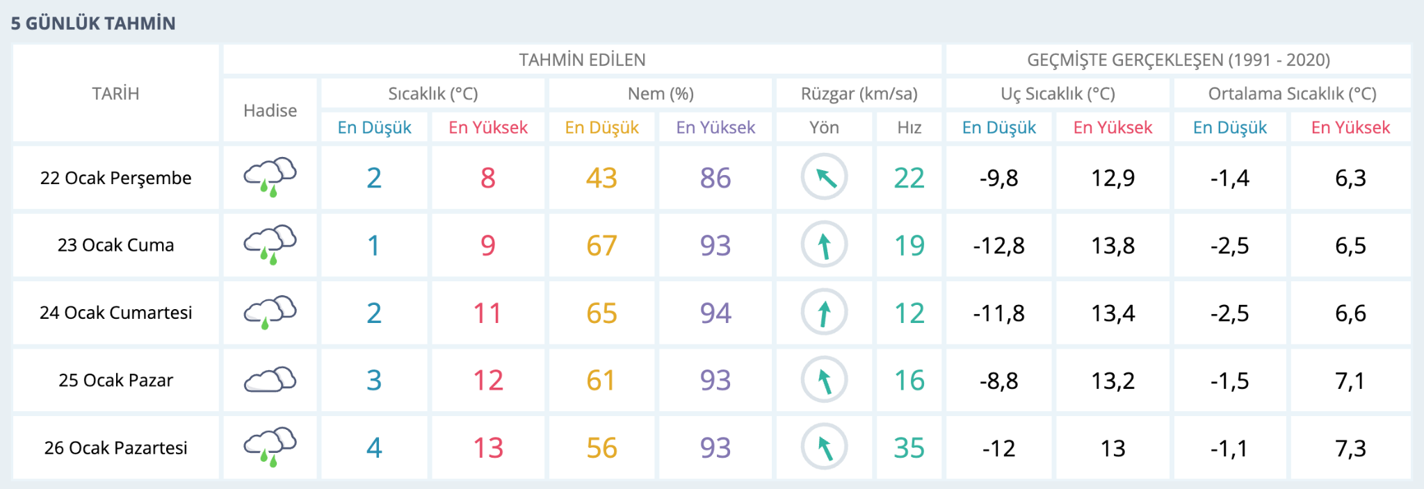 Rüzgar hızının en fazla 26 Ocak Pazartesi günü 35 km/sa seviyesine çıkması bekleniyor.