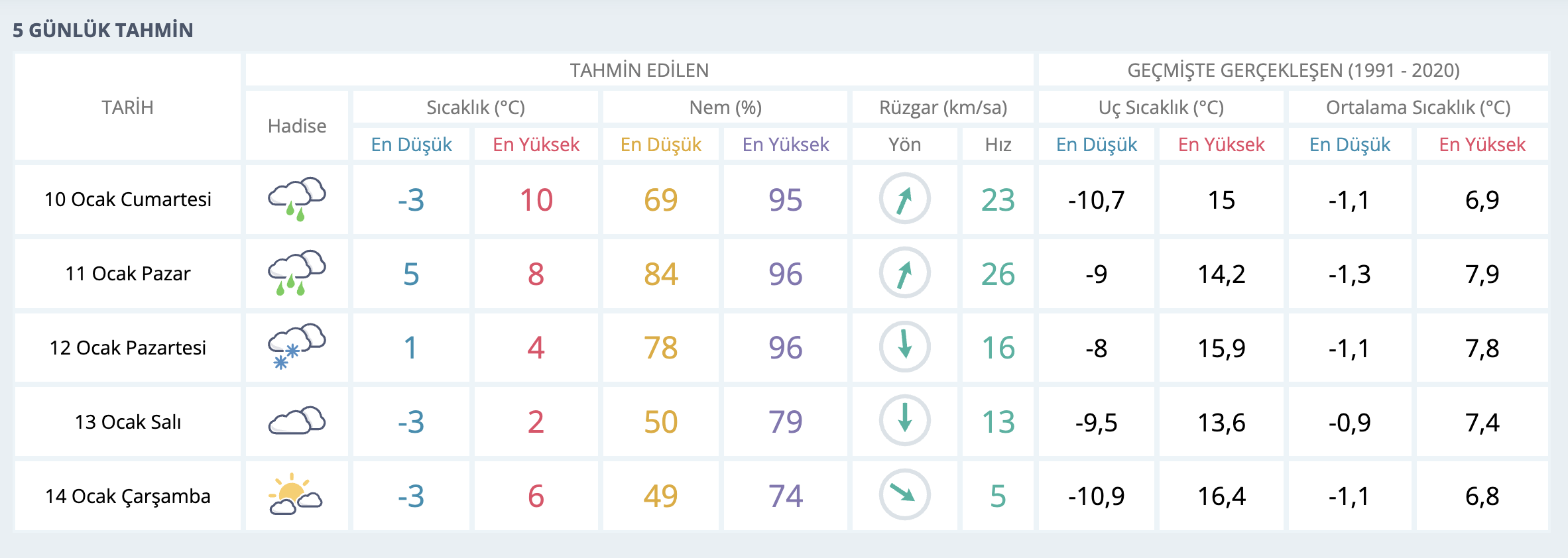 11 Ocak Pazar günü de kent genelinde yağmur bekleniyor. En düşük sıcaklık 5 derece, en yüksek sıcaklık ise 8 derece olacak. Nem oranı yüzde 84 ile yüzde 96 arasında seyredecek. Rüzgârın hızının saatte 26 kilometreye kadar çıkabileceği tahmin ediliyor.